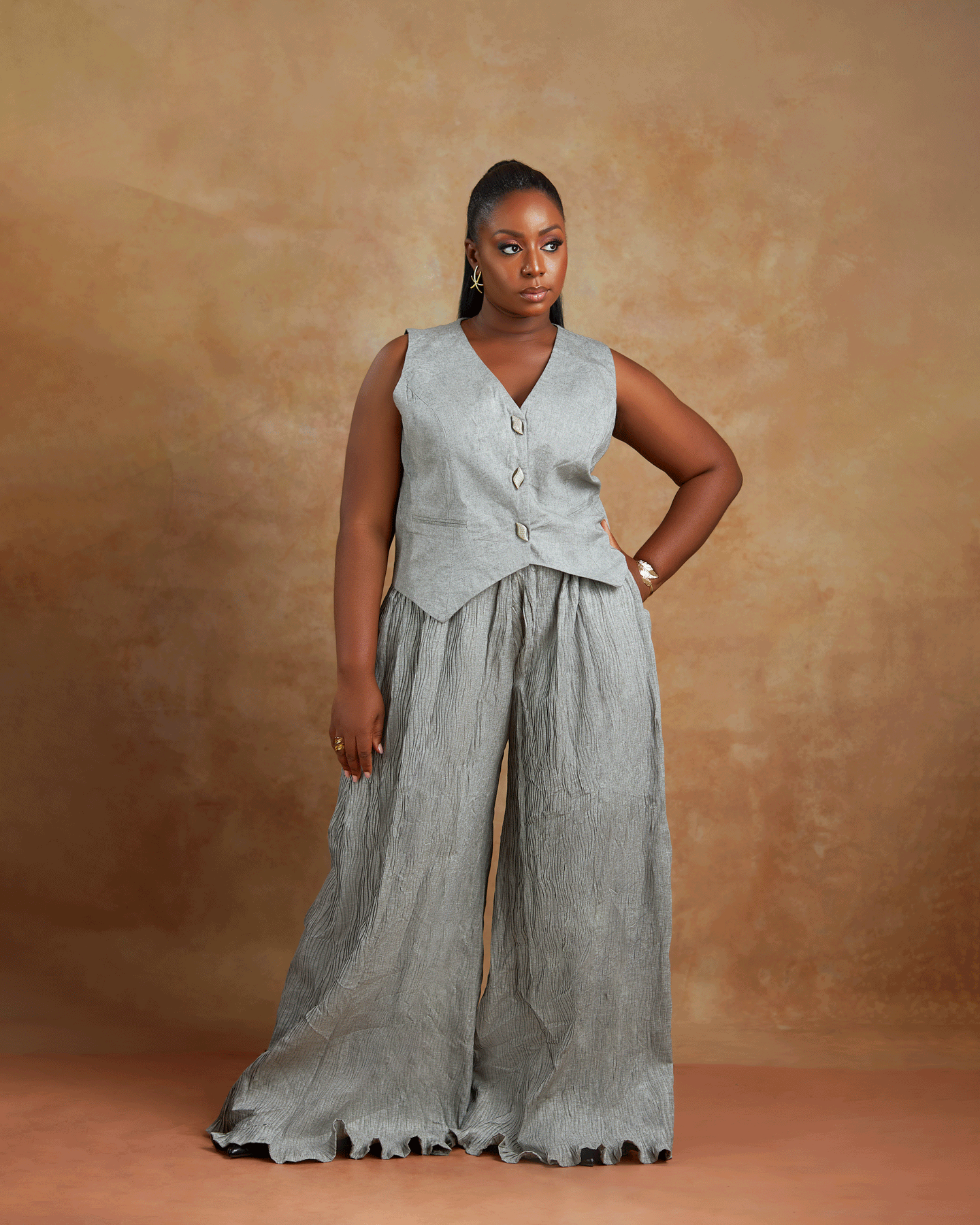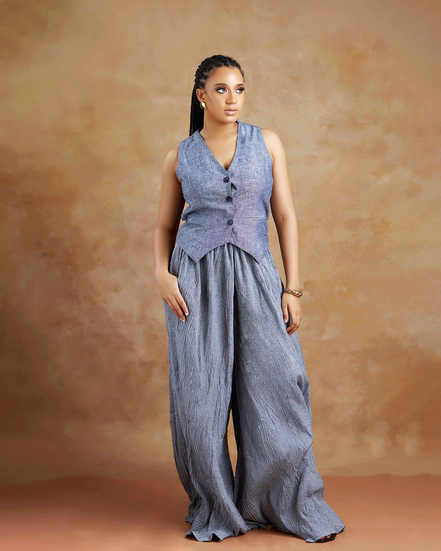 The sleeveless vest features a sculpted waistline, pointed hem, and statement buttons that create a flattering silhouette while adding timeless sophistication. Paired with ultra-wide palazzo pants that flow beautifully and offer all-day comfort. The soft, crushed texture of the plisse linen adds movement and character to the palazzo, making each piece unique.